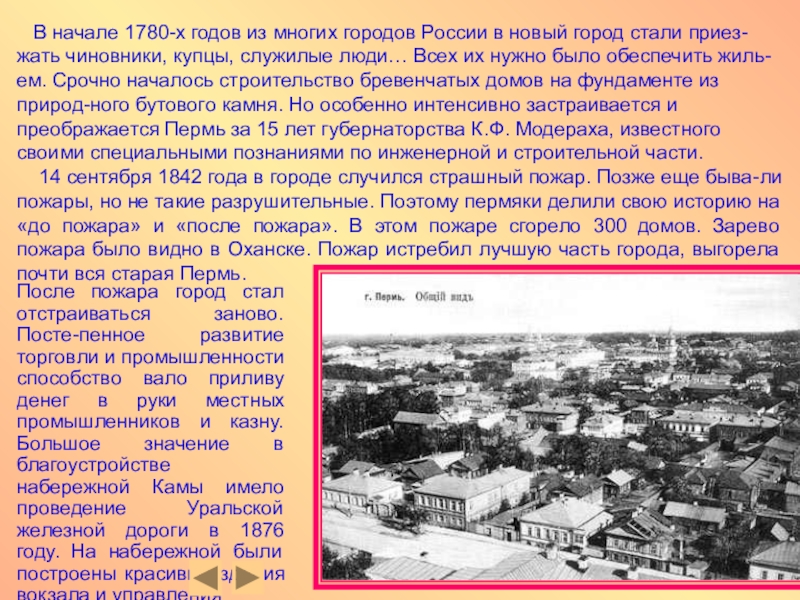 После пожара город стал отстраиваться заново. Посте-пенное развитие торговли и промышленности способство вало приливу денег в руки местных промышленников и казну. Большое значение в благоустройстве набережной Камы имело проведение Уральской железной дороги в 1876 году. На набережной были построены красивые здания вокзала и управления