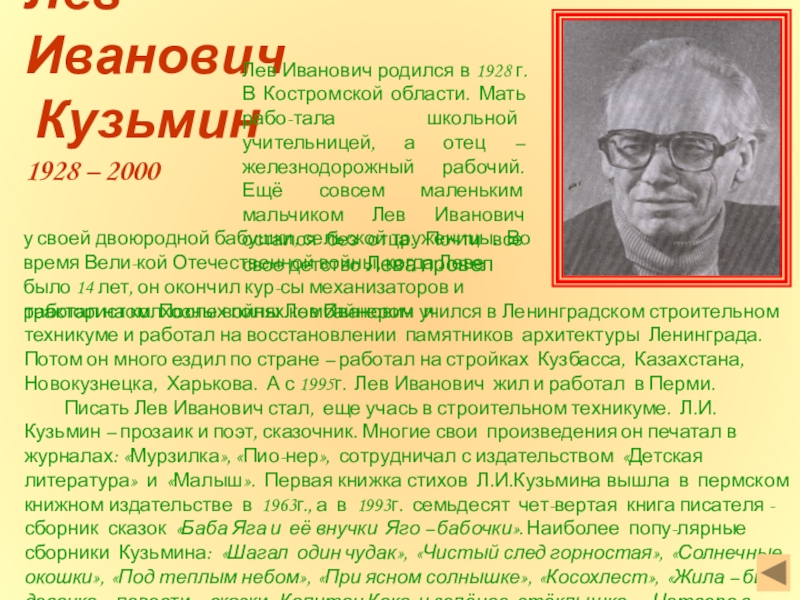 . Во время Великой Отечественной войны он сражался на фронте. А прежде чем начать писать, Владимир Иванович поменял много профес-сий. Он был механиком, и электриком, и учителем английского языка, и даже сторожем. Потом Владимир Иванович работал в газете корреспондентом. Свое первое произведение, рассказ «Первый урок» писатель написал в Пятигорске, куда он приехал после ранения, а напечатал его в 1949г. в Перми, в газете «Звезда».
