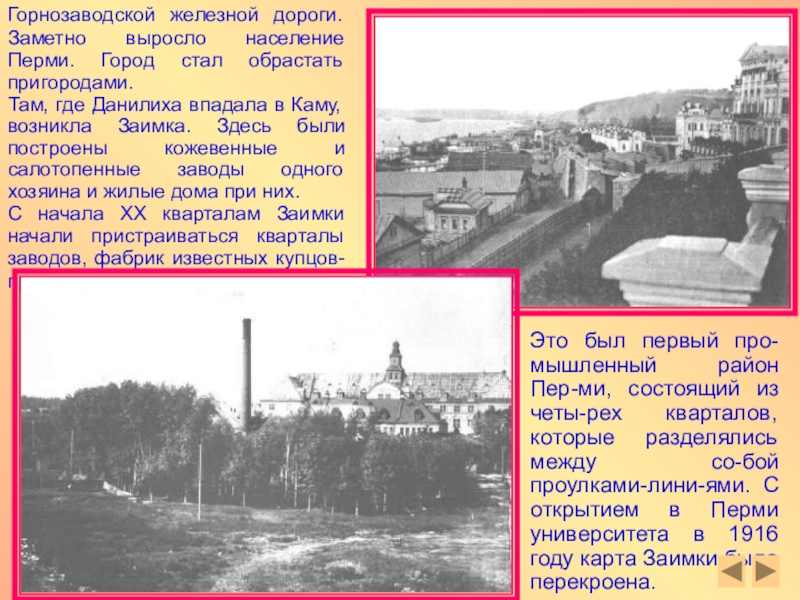 Это был первый про-мышленный район Пер-ми, состоящий из четы-рех кварталов, которые разделялись между со-бой проулками-лини-ями. С открытием в Перми университета в 1916 году карта Заимки была перекроена.