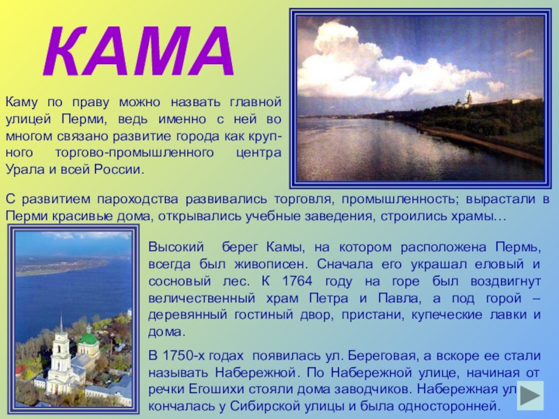 Высокий берег Камы, на котором расположена Пермь, всегда был живописен. Сначала его украшал еловый и сосновый лес. К 1764 году на горе был воздвигнут величественный храм Петра и Павла, а под горой – деревянный гостиный двор, пристани, купеческие лавки и дома.