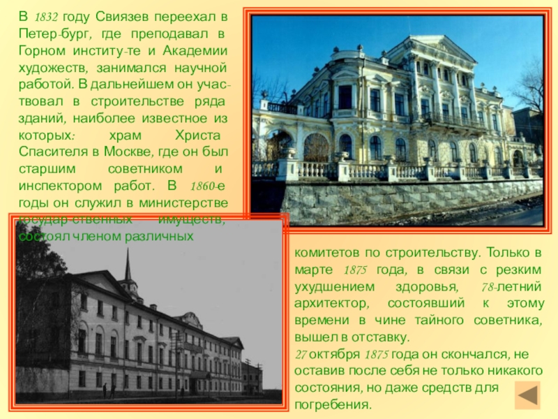 В 1832 году Свиязев переехал в Петер-бург, где преподавал в Горном институ-те и Академии художеств, занимался научной работой. В дальнейшем он учас-твовал в строительстве ряда зданий, наиболее известное из которых: храм Христа Спасителя в Москве, где он был старшим советником и инспектором работ. В 1860-е годы он служил в министерстве государ-ственных имуществ, состоял членом различных