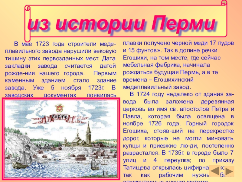 В 1724 году недалеко от здания за-вода была заложена деревянная церковь во имя св. апостолов Петра и Павла, которая была освящена в ноябре 1726 года. Горный городок Егошиха, стояв-ший на перекрестке дорог, которые не могли миновать купцы и приезжие лю-ди, постепенно разрастался. В 1735г. в городе было 7 улиц и 4 переулка; по приказу Татищева открылась цифирная школа, так как рабочим нужны были элементарные знания матема-