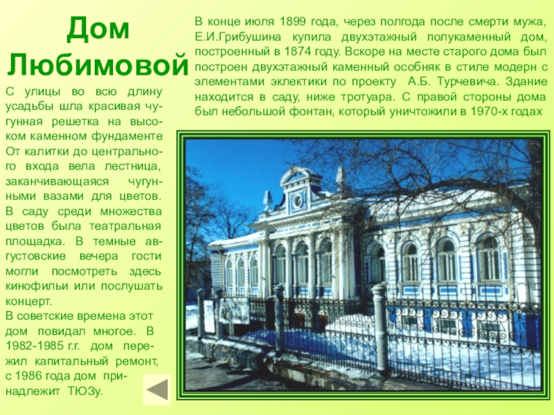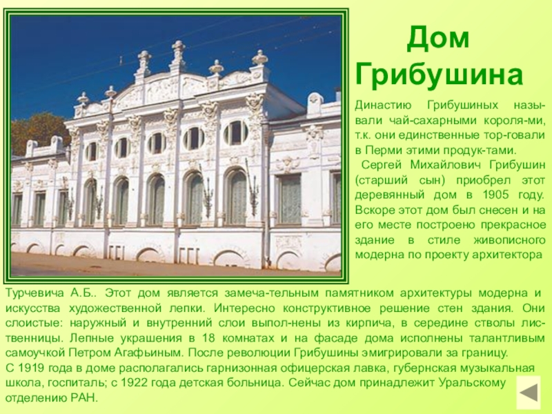 Турчевича А.Б.. Этот дом является замеча-тельным памятником архитектуры модерна и искусства художественной лепки. Интересно конструктивное решение стен здания. Они слоистые: наружный и внутренний слои выпол-нены из кирпича, в середине стволы лис-твенницы. Лепные украшения в 18 комнатах и на фасаде дома исполнены талантливым самоучкой Петром Агафьиным. После революции Грибушины эмигрировали за границу.