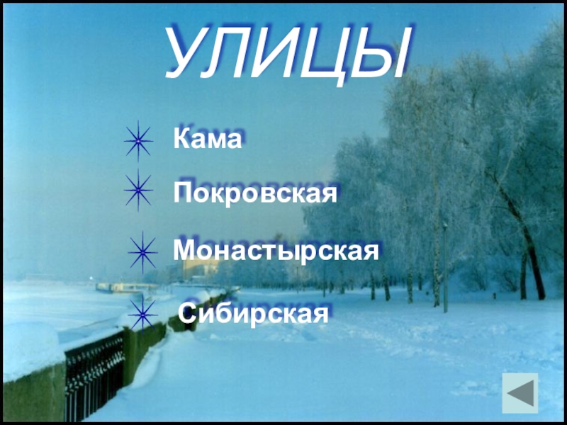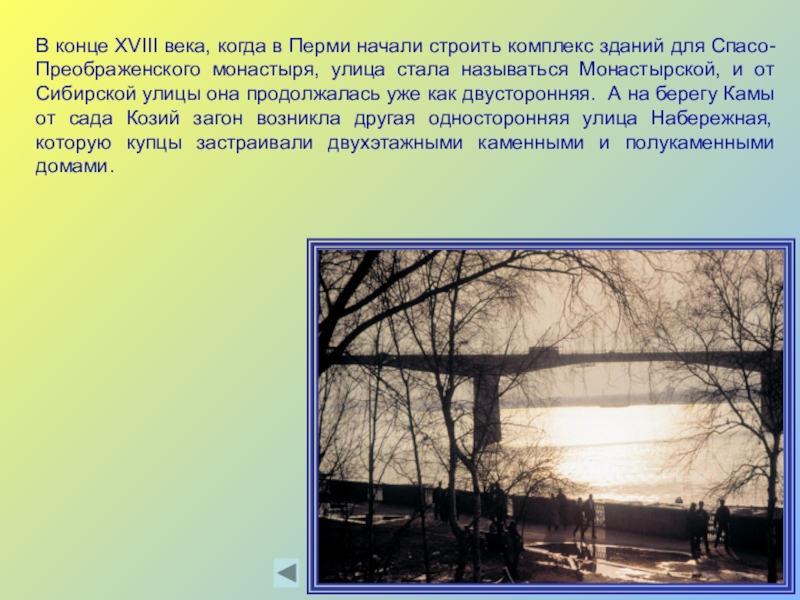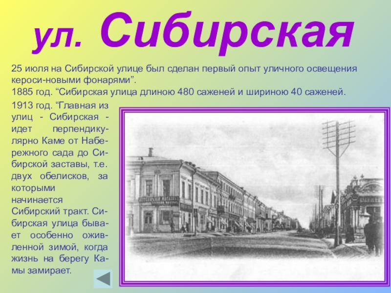 1913 год. “Главная из улиц - Сибирская - идет перпендику-лярно Каме от Набе-режного сада до Си-бирской заставы, т.е. двух обелисков, за которыми начинается Сибирский тракт. Си-бирская улица быва-ет особенно ожив-ленной зимой, когда жизнь на берегу Ка-мы замирает.