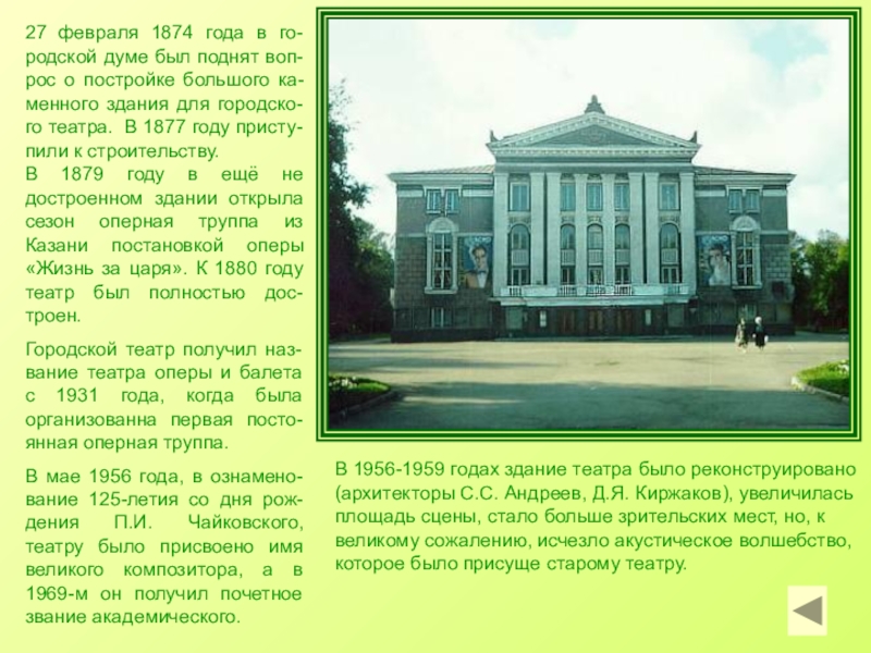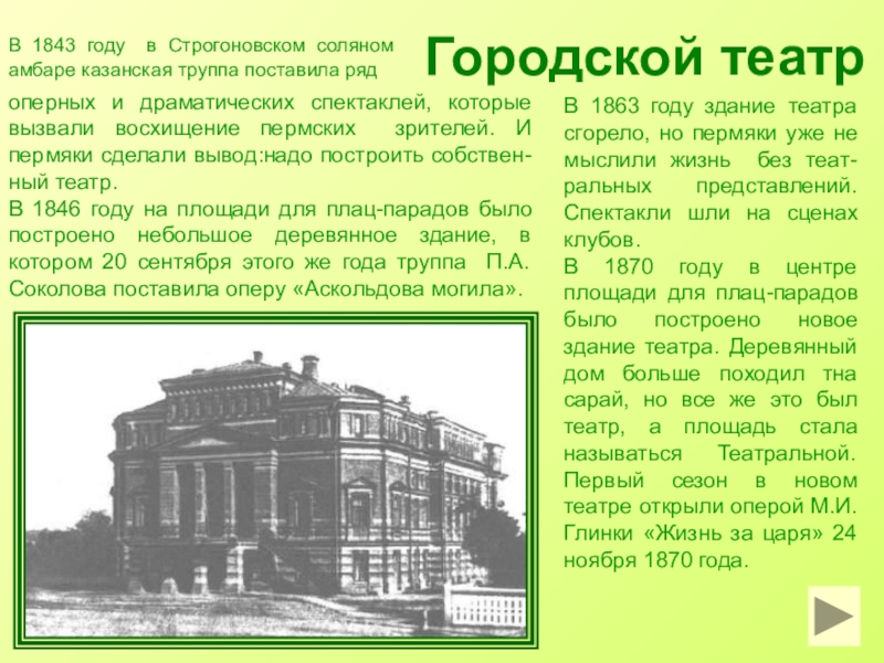 оперных и драматических спектаклей, которые вызвали восхищение пермских зрителей. И пермяки сделали вывод:надо построить собствен-ный театр.
