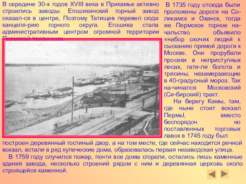 В середине 30-х годов XVIII века в Прикамье активно строились заводы. Егошихинский горный завод оказал-ся в центре, Поэтому Татищев перевел сюда канцеля-рию горного округа. Егошиха стала административным центром огромной территории Пермской провинции.