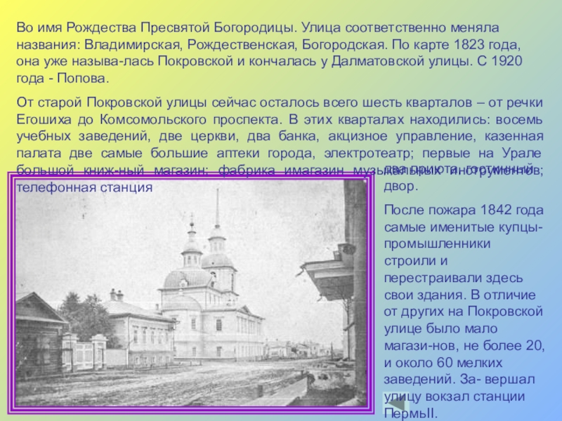 После пожара 1842 года самые именитые купцы-промышленники строили и перестраивали здесь свои здания. В отличие от других на Покровской улице было мало магази-нов, не более 20, и около 60 мелких заведений. За- вершал улицу вокзал станции ПермьII.