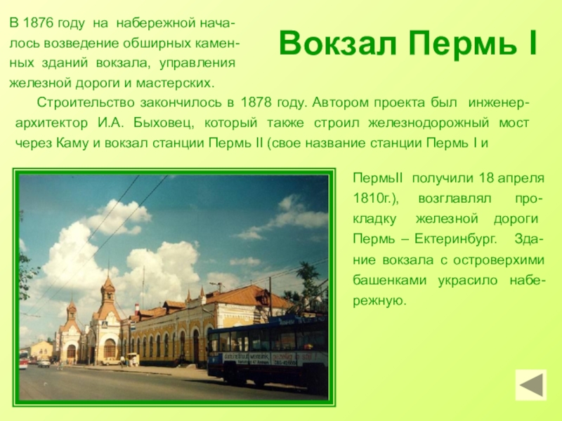Пермь – Ектеринбург. Зда-ние вокзала с островерхими башенками украсило набе-режную.