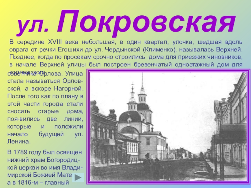 советника Орлова. Улица стала называться Орлов-ской, а вскоре Нагорной. После того как по плану в этой части города стали сносить старые дома, поя-вились две линии, которые и положили начало будущей ул. Ленина.