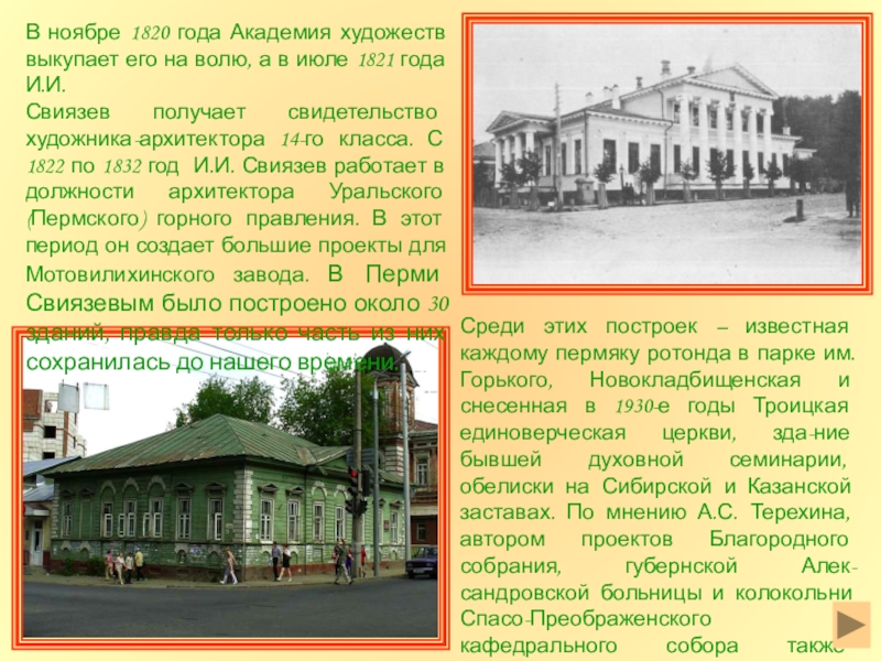 Свиязев получает свидетельство художника-архитектора 14-го класса. С 1822 по 1832 год И.И. Свиязев работает в должности архитектора Уральского (Пермского) горного правления. В этот период он создает большие проекты для Мотовилихинского завода. В Перми Свиязевым было построено около 30 зданий, правда только часть из них сохранилась до нашего времени.