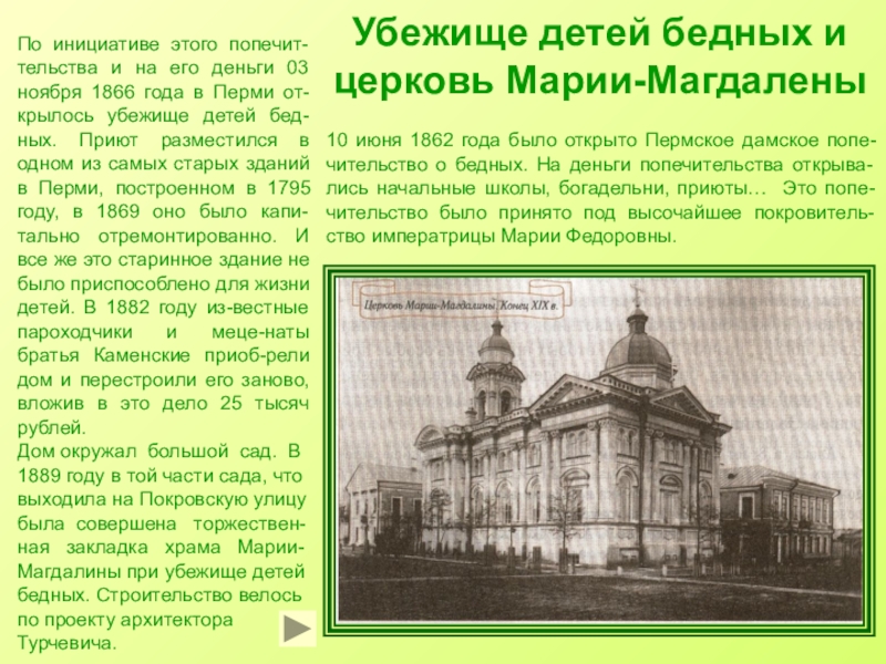 По инициативе этого попечит-тельства и на его деньги 03 ноября 1866 года в Перми от-крылось убежище детей бед-ных. Приют разместился в одном из самых старых зданий в Перми, построенном в 1795 году, в 1869 оно было капи-тально отремонтированно. И все же это старинное здание не было приспособлено для жизни детей. В 1882 году из-вестные пароходчики и меце-наты братья Каменские приоб-рели дом и перестроили его заново, вложив в это дело 25 тысяч рублей.