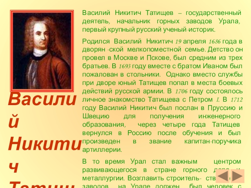 Василий Никитич Татищев – государственный деятель, начальник горных заводов Урала, первый крупный русский ученый-историк.