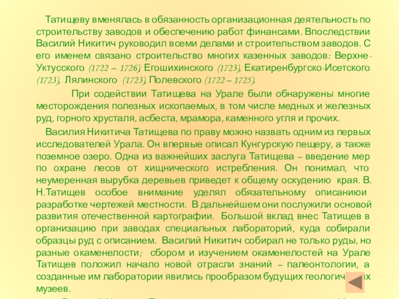 В то время Урал стал важным центром развивающегося в стране горного дела и металлургии. Возглавить строитель- ство новых заводов на Урале должен был человек с твердым характером и талантом организатора. Выбор пал на В.Н.Татищева.