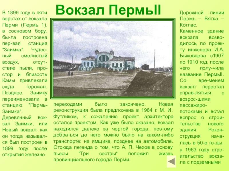 переходами было закончено. Новая реконструкция была предложена в 1984 г. М. И. Футликом, к сожалению проект архитектора остался проектом. Как уже было сказано, вокзал находился далеко за чертой города, поэтому добраться до него можно было на каком-либо транспорте: на ямщике, позднее на автомобиле. Отсюда легенда о том, что А. П. Чехов в основу пьесы "Три сестры" положил жизнь провинциального города Перми.