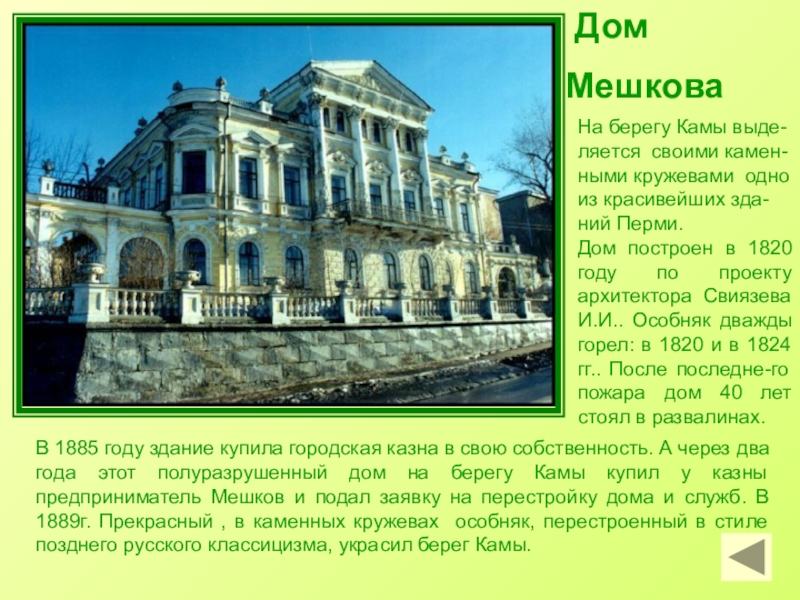 В 1885 году здание купила городская казна в свою собственность. А через два года этот полуразрушенный дом на берегу Камы купил у казны предприниматель Мешков и подал заявку на перестройку дома и служб. В 1889г. Прекрасный , в каменных кружевах особняк, перестроенный в стиле позднего русского классицизма, украсил берег Камы.