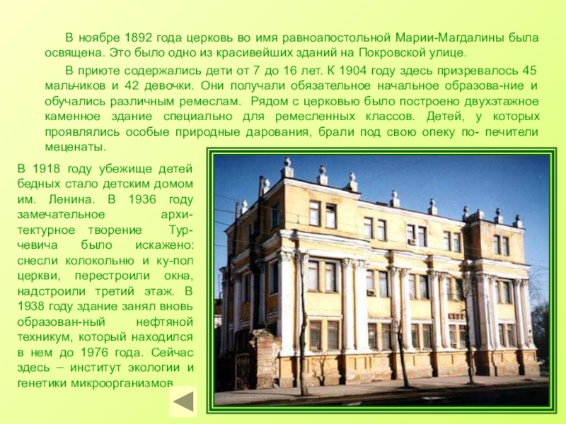 В 1918 году убежище детей бедных стало детским домом им. Ленина. В 1936 году замечательное архи-тектурное творение Тур-чевича было искажено: снесли колокольню и ку-пол церкви, перестроили окна, надстроили третий этаж. В 1938 году здание занял вновь образован-ный нефтяной техникум, который находился в нем до 1976 года. Сейчас здесь – институт экологии и генетики микроорганизмов.