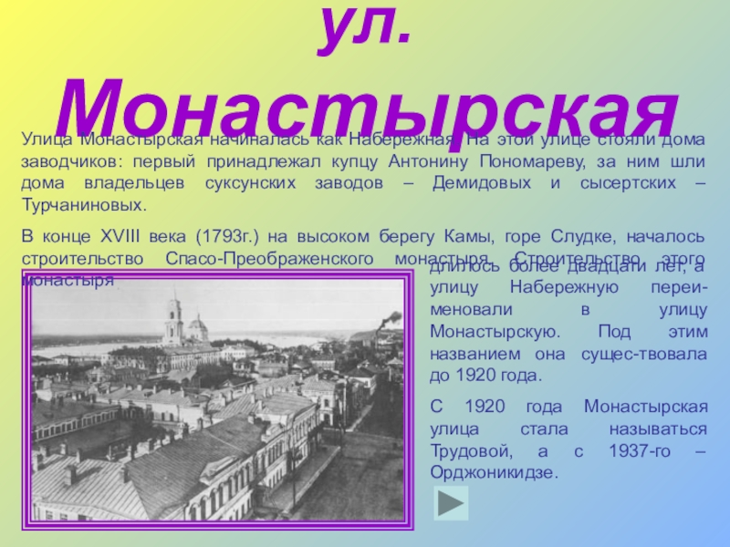 длилось более двадцати лет, а улицу Набережную переи-меновали в улицу Монастырскую. Под этим названием она сущес-твовала до 1920 года.