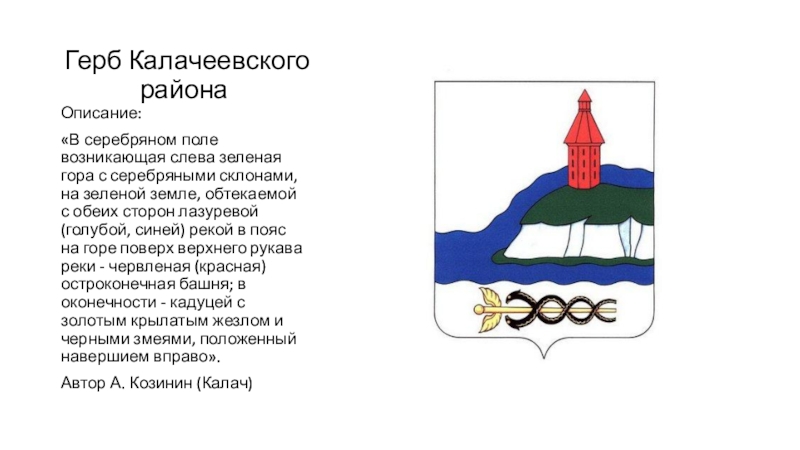 Герб Калачеевского района Описание: «В серебряном поле возникающая слева зеленая гора с серебряными склонами, на зеленой земле,