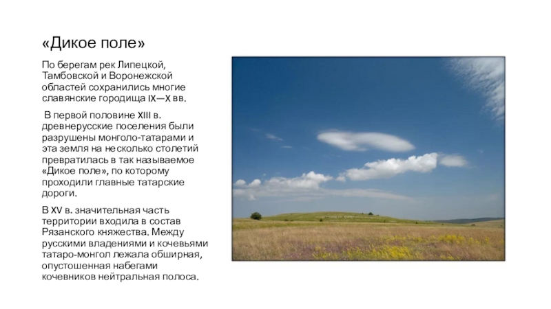 «Дикое поле»По берегам рек Липецкой, Тамбовской и Воронежской областей сохранились многие славянские городища IX—X вв. В первой