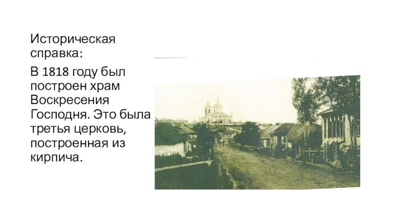 Историческая справка:В 1818 году был построен храм Воскресения Господня. Это была третья церковь, построенная из кирпича.