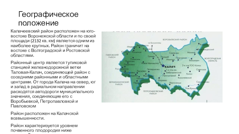 Географическое положениеКалачеевский район расположен на юго-востоке Воронежской области и по своей площади (2132 кв. км) является одним