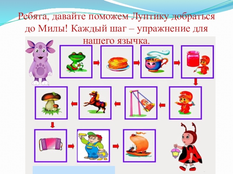 Ребята, давайте поможем Лунтику добраться до Милы! Каждый шаг – упражнение для нашего язычка.
