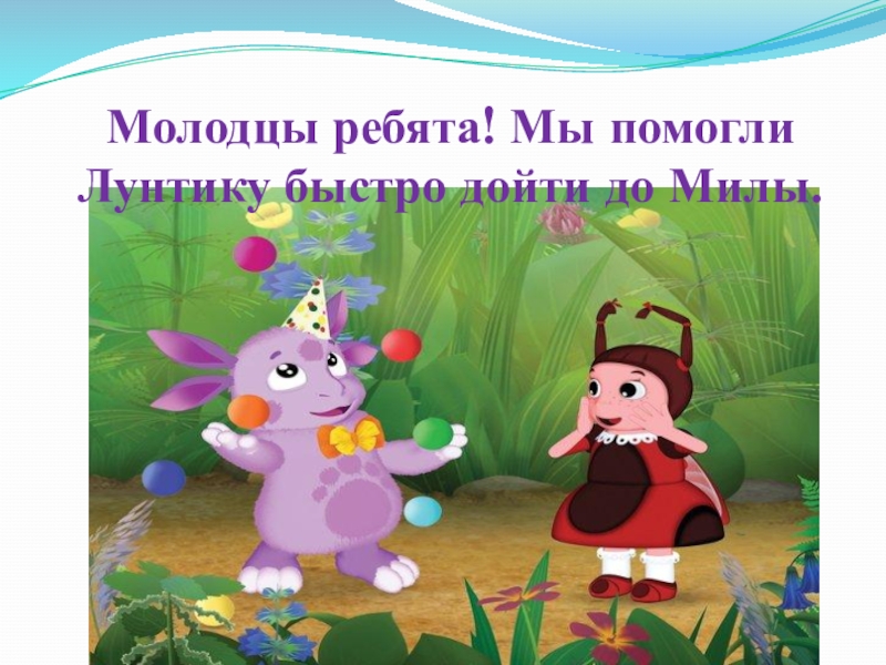 Слайд 14Молодцы ребята! Мы помогли Лунтику быстро дойти до Милы.