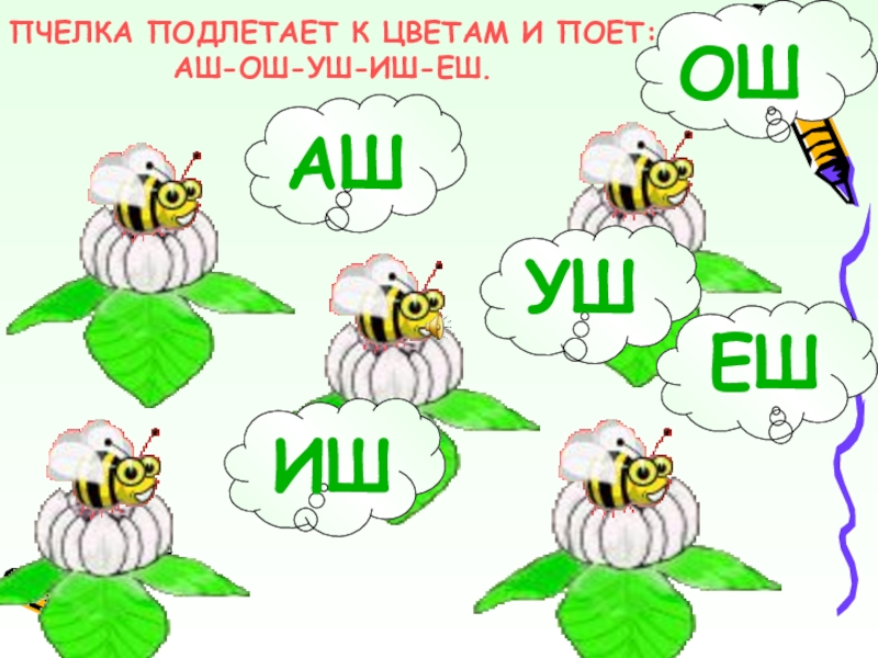Слайд 4ПЧЕЛКА ПОДЛЕТАЕТ К ЦВЕТАМ И ПОЕТ: АШ-ОШ-УШ-ИШ-ЕШ.