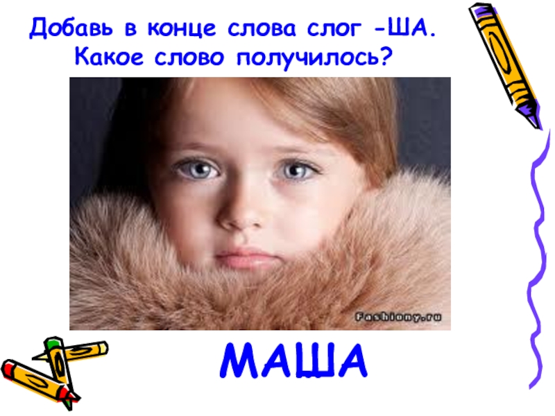 Слайд 8Добавь в конце слова слог -ША. Какое слово получилось?