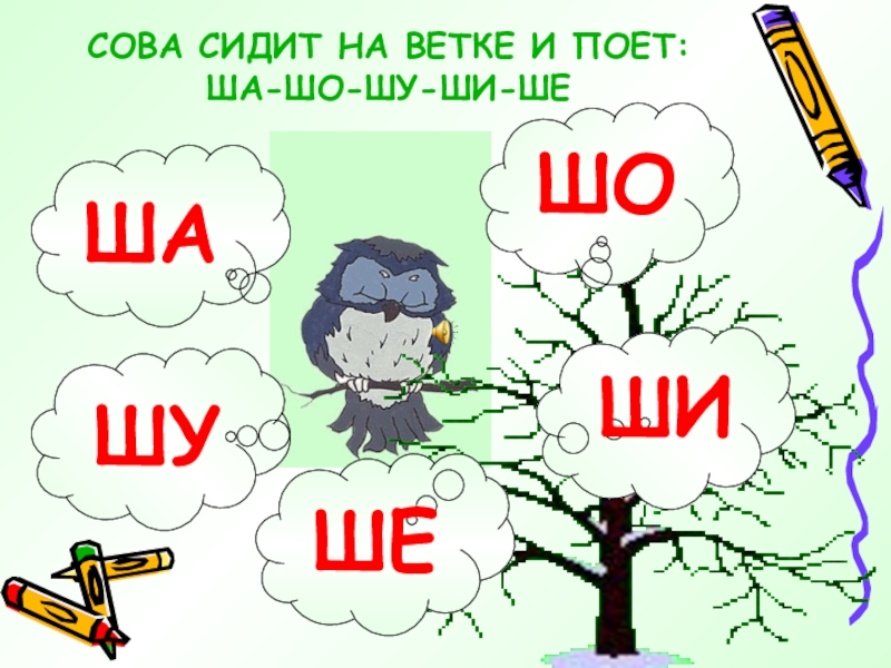 Слайд 3СОВА СИДИТ НА ВЕТКЕ И ПОЕТ: ША-ШО-ШУ-ШИ-ШЕ