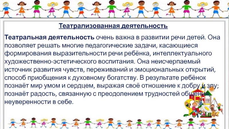 Театральная деятельность очень важна в развитии речи детей. Она позволяет