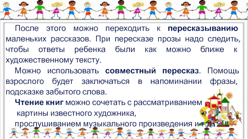 Слайд 6После этого можно переходить к пересказыванию маленьких рассказов. При пересказе прозы