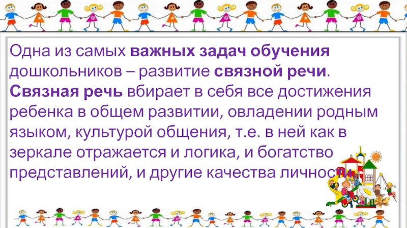 Слайд 2Одна из самых важных задач обучения дошкольников – развитие связной речи.