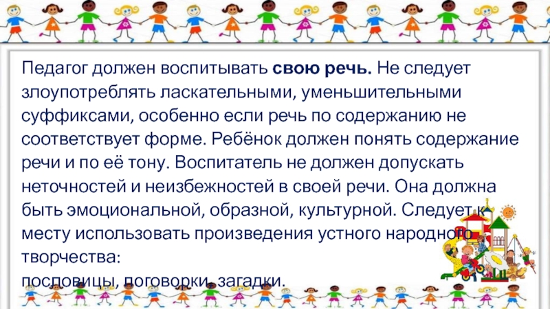 Слайд 9Педагог должен воспитывать свою речь. Не следует злоупотреблять ласкательными, уменьшительными суффиксами,