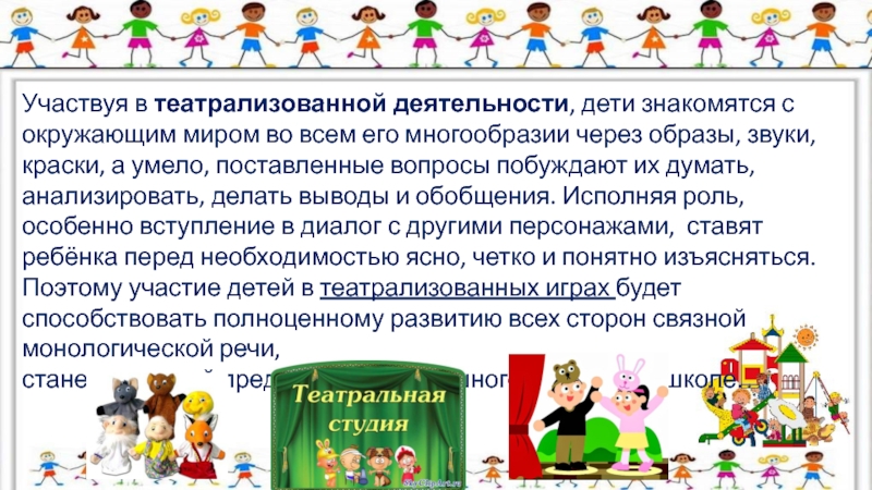 Слайд 16Участвуя в театрализованной деятельности, дети знакомятся с окружающим миром во всем