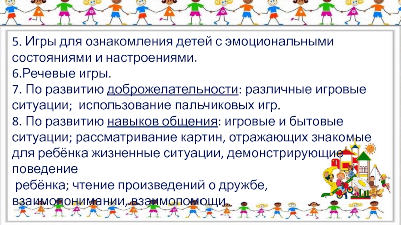 По развитию доброжелательности: различные игровые ситуации; использование пальчиковых игр.