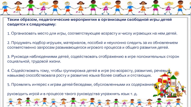 Слайд 11Таким образом, педагогические мероприятия в организации свободной игры детей сводятся к