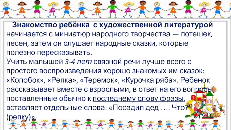 потешек, песен, затем он слушает народные сказки, которые полезно пересказывать.