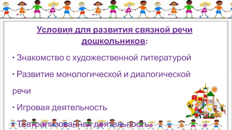 Слайд 4Условия для развития связной речи дошкольников: