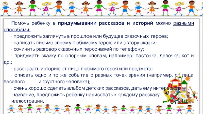 Слайд 7Помочь ребенку в придумывании рассказов и историй можно разными способами:
