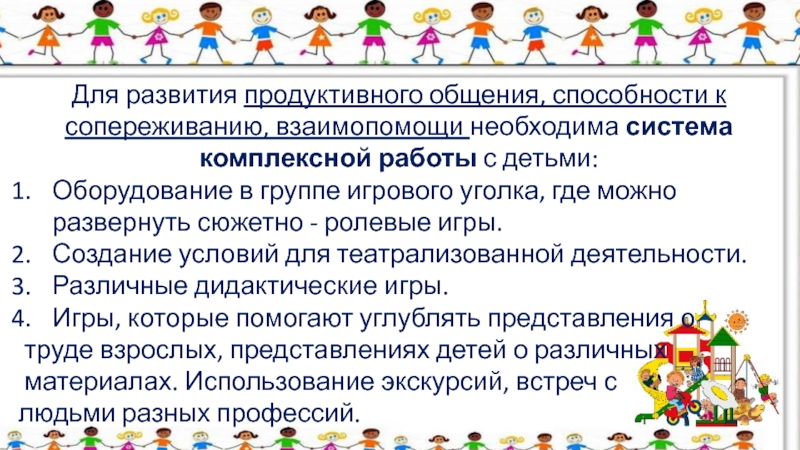 Слайд 12Для развития продуктивного общения, способности к сопереживанию, взаимопомощи необходима система комплексной
