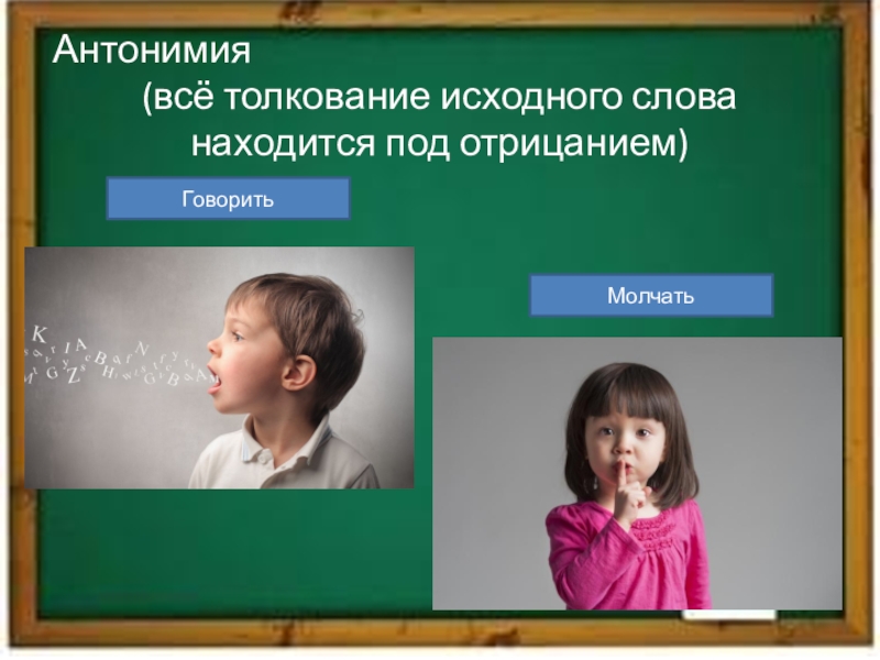 Антонимия (всё толкование исходного слова находится под отрицанием)ГоворитьМолчать
