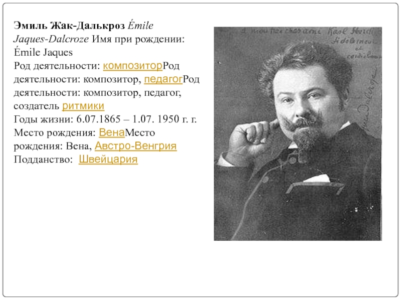 Слайд 3Эмиль Жак-Далькроз Émile Jaques-Dalcroze Имя при рождении: Émile Jaques
