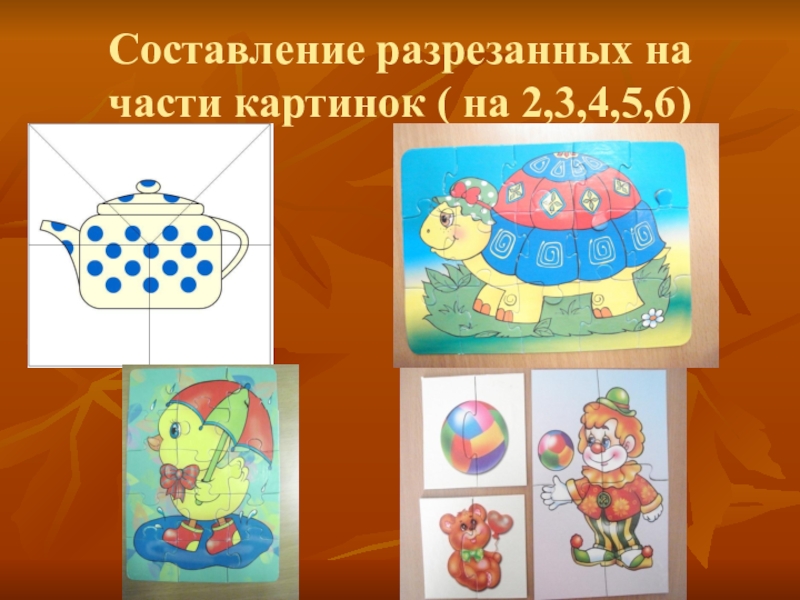 Слайд 17Составление разрезанных на части картинок ( на 2,3,4,5,6)