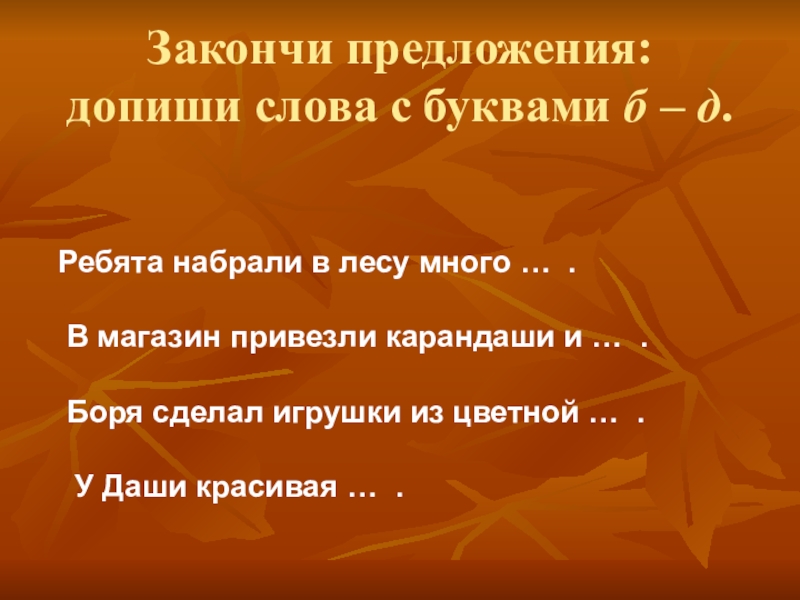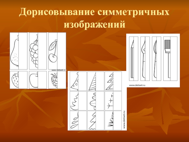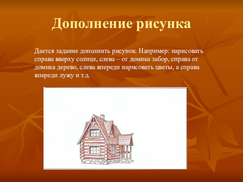 Дается задание дополнить рисунок. Например: нарисовать справа вверху солнце, слева