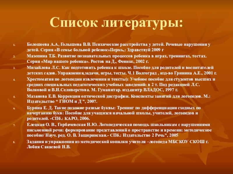 Мазанова Е.В. Коррекция оптической дисграфии. Конспекты занятий для логопедов. М.: Издательство “ ГНОМ и Д ”, 2007.