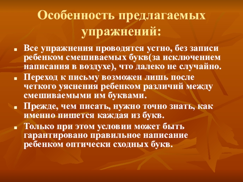 Все упражнения проводятся устно, без записи ребенком смешиваемых букв(за