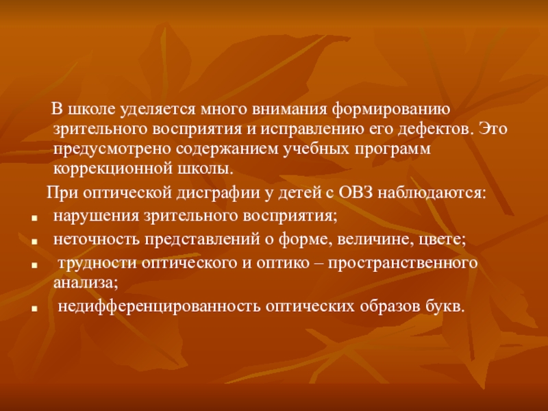 В письменной речи детей с ограниченными возможностями здоровья встречаются ошибки оптического характера. Оптические ошибки связаны с недоразвитием зрительного гнозиса, анализа и синтеза. В основе подобных ошибок лежат трудности оптического и оптико-пространственного анализа, недифференцированность зрительных представлений, нарушения зрительного восприятия и памяти, недоразвитие пространственных представлений, а также левшество скрытое и истинное.