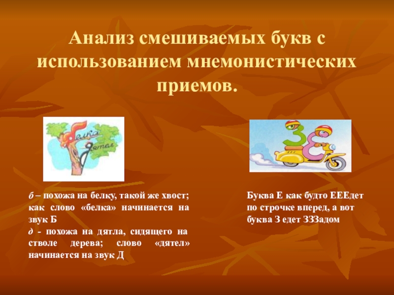 Анализ смешиваемых букв с использованием мнемонистических приемов.