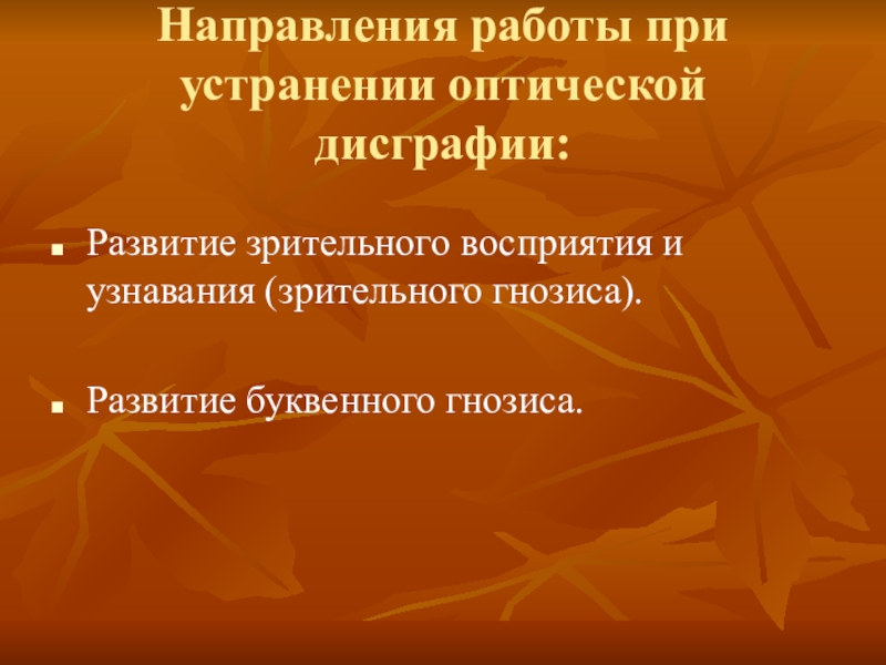 Слайд 5Направления работы при устранении оптической дисграфии: